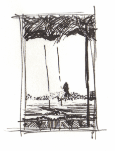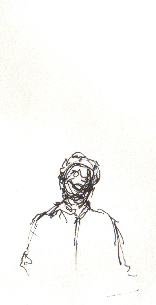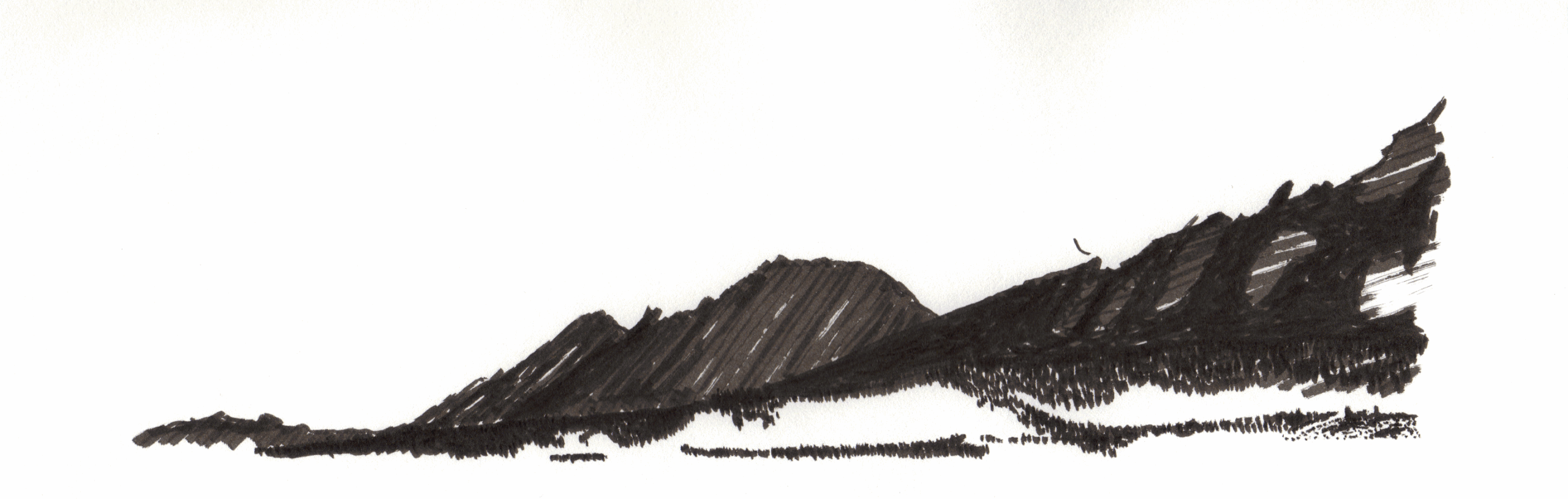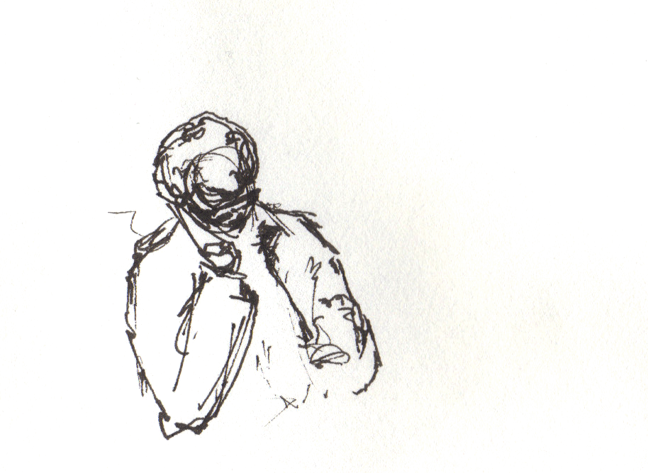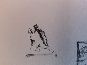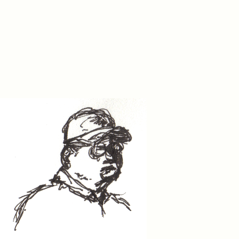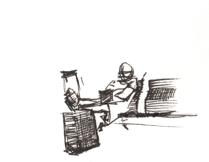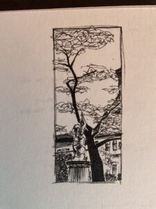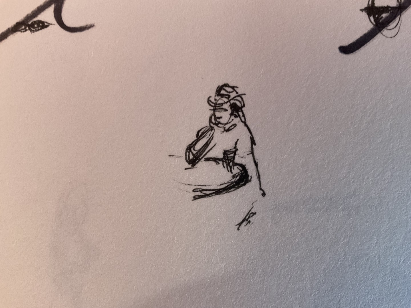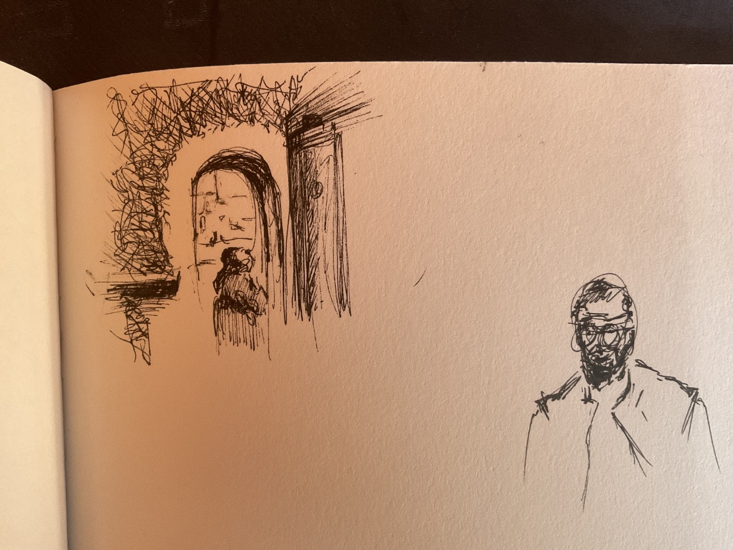 My preferred medium is black ink and paper. I come back to Micron, Rotring, Sharpie gel, Staedtler, and most enjoy architecture, landscapes, and figures — especially at the airport — though I just draw what I’m looking at.